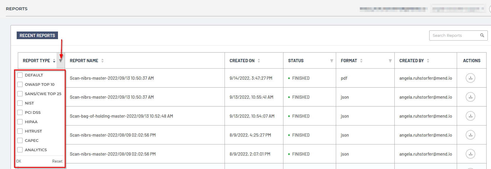 You can filter the Reports dashboard via the Report Type, Status, and Format columns, for example: