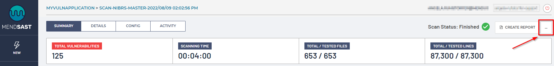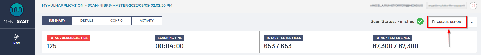 You can create a scan report by clicking on the Create Report option in the top-right corner of the UI within any of the Scans Tab pages: Summary, Details, Config, and Activity. For example: