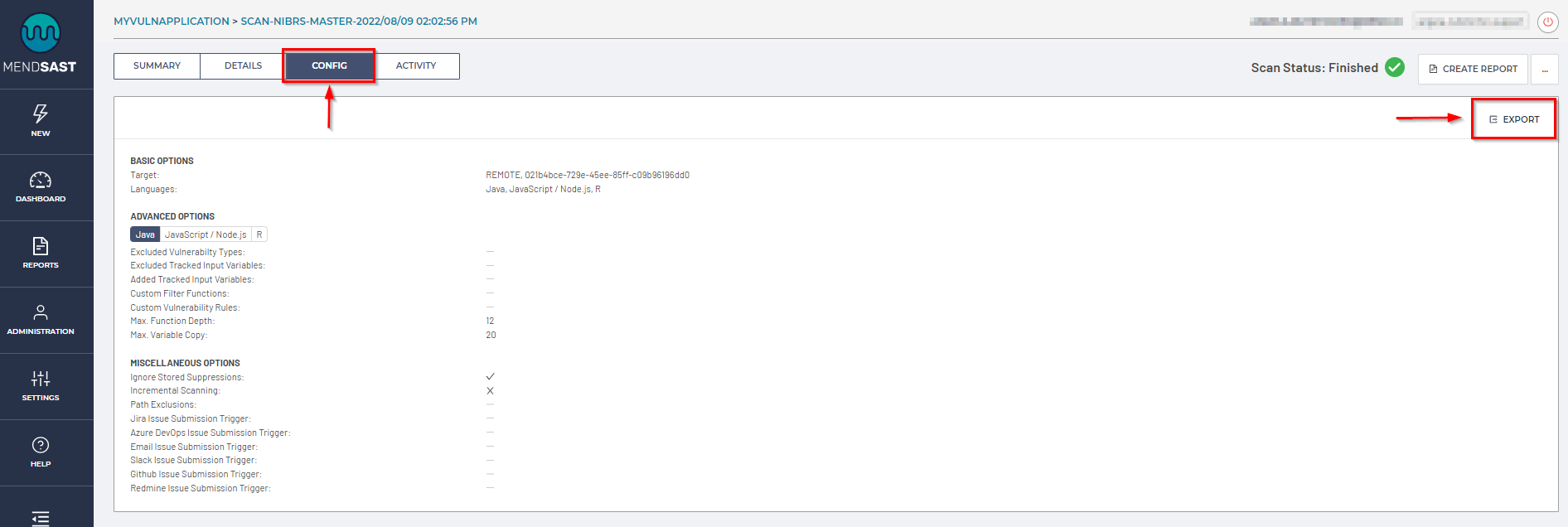 The scan Config tab displays the configuration used for the specific scan. You can also export this configuration into a JSON file to use for future SAST scans by clicking on Export: