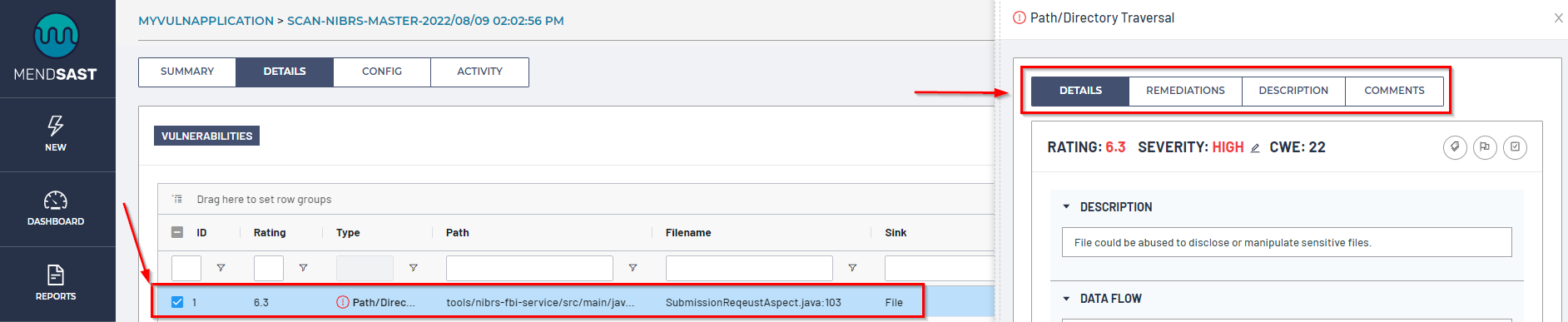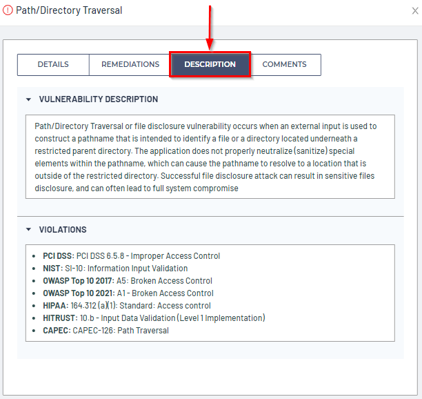 To view a detailed explanation of a vulnerability, simply click on the desired vulnerability within the table to open the information window of that vulnerability, which will open a sidebar that includes the vulnerability’s Details, Remediations, Description, and Comments tabs: