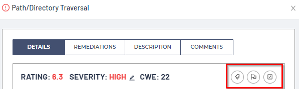 Suppress / unsuppress a vulnerability (Flag icon): Suppress / unsuppress this vulnerability. Reasons to Suppress an individual vulnerability or entire vulnerability type/group can be for scenarios such as false positives or accepted risks.