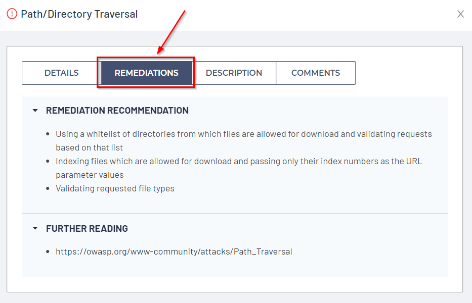 The vulnerability Remediations tab provides details on the Remediation Recommendations to correct the vulnerability: