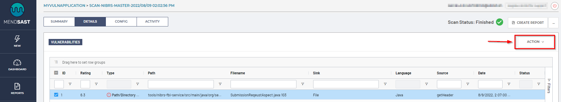 Within the scan’s Details tab, you can complete actions on selected vulnerabilities from the table by clicking on Action: