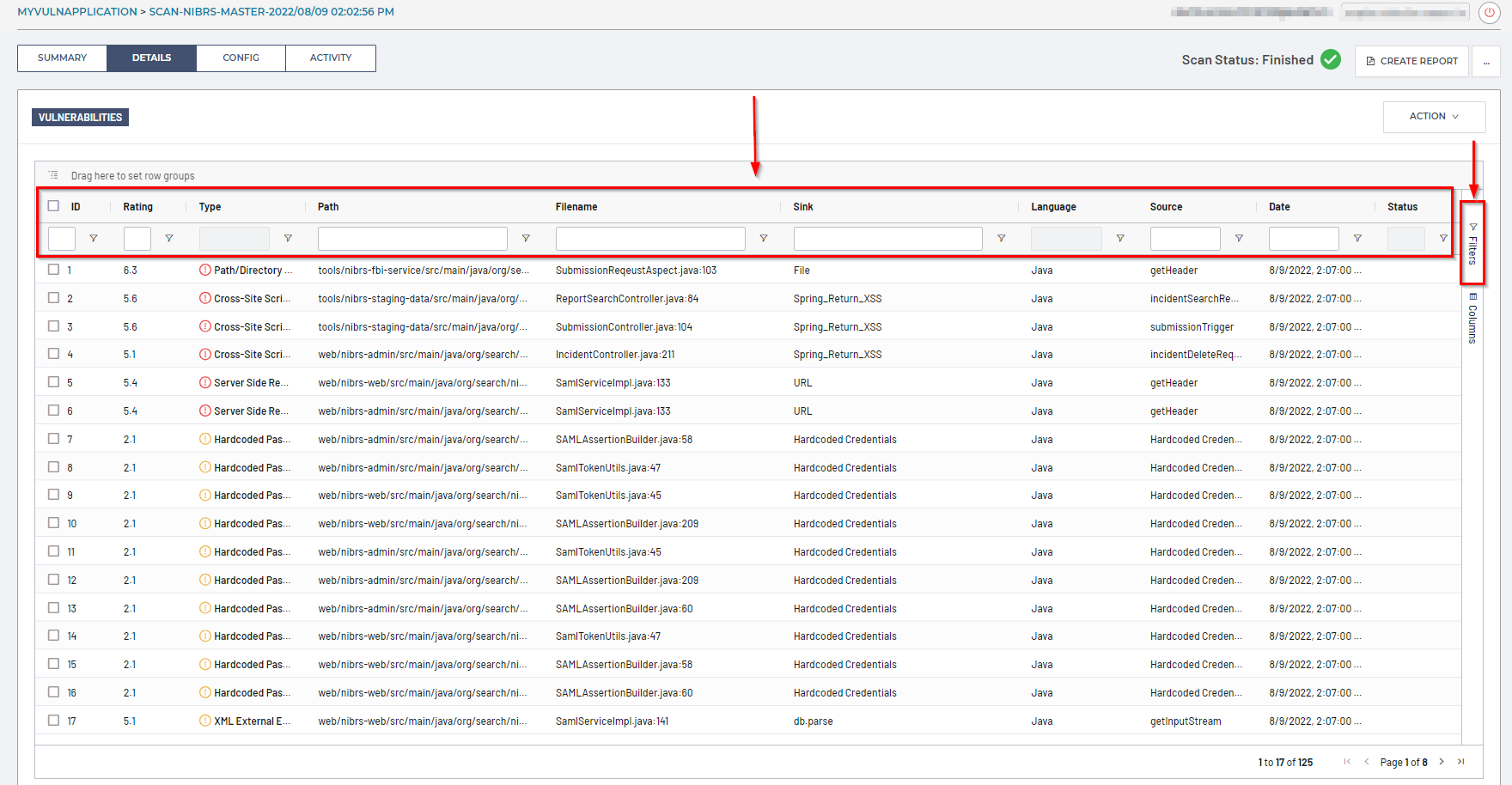 To filter the findings within the scan’s Details table, you can click on the Filters icon underneath each column header, or, click on the Filters option on the right side of the table: