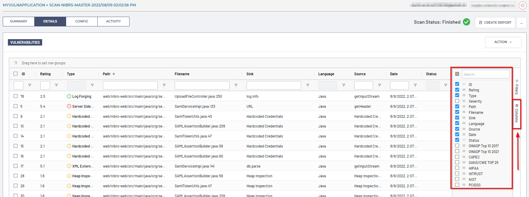 To show or hide columns within the scan’s Details table, click on the Columns option on the right side of the table: