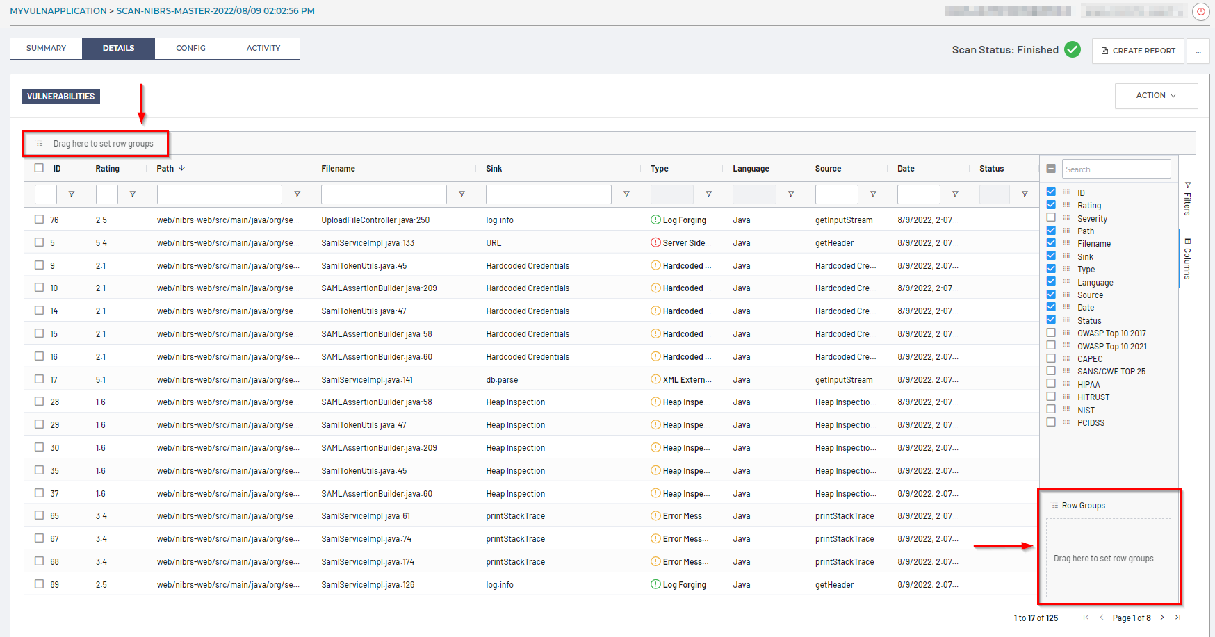You can group vulnerabilities by dragging a column to the top bar above the table, or via the Columns > Row Groups section to create a flexible hierarchy of your scan data.