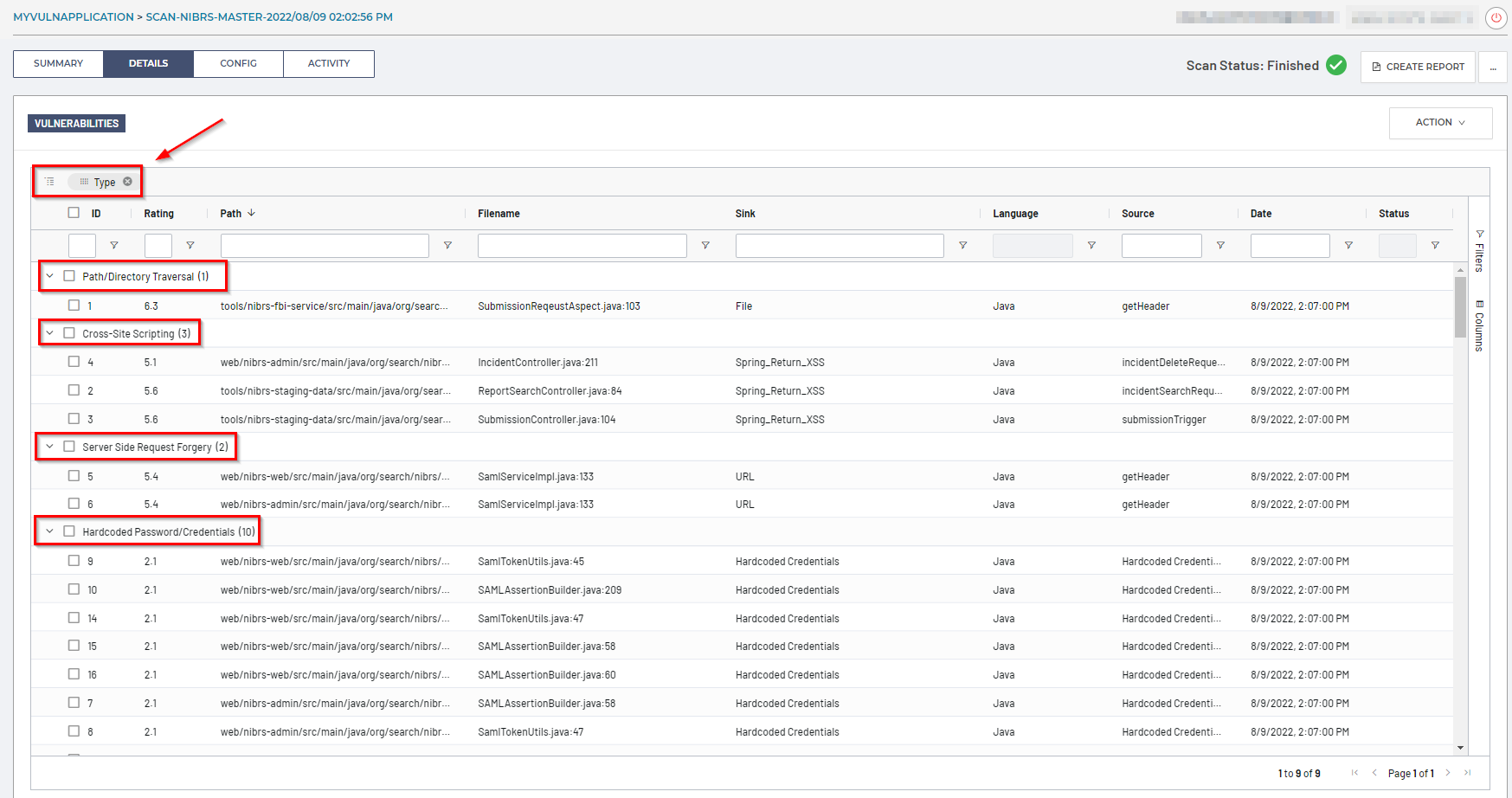 For example, dragging the Type column to Row Groups will reorganize the Details table by Vulnerability Type, as seen here: