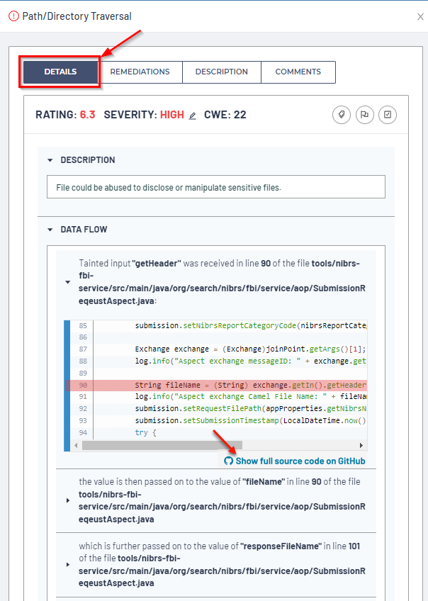 The vulnerability Details tab provides the Rating, Severity, CWE ID, a brief Description, and an advanced Data Flow explanation on how the exploit works.