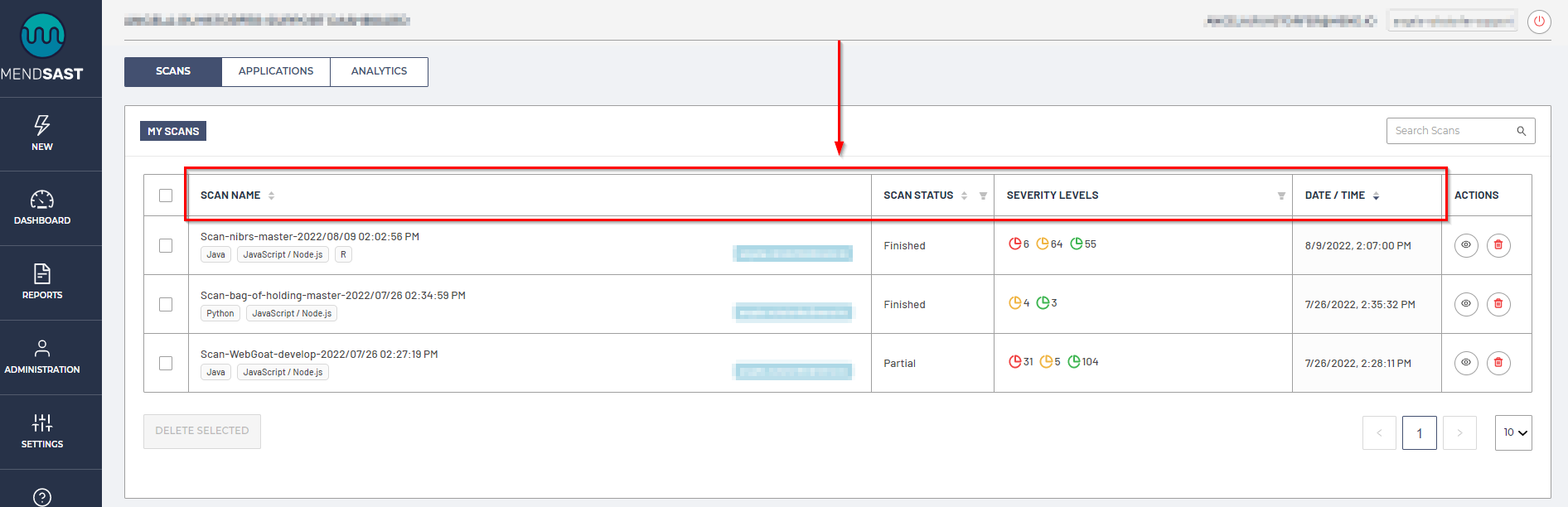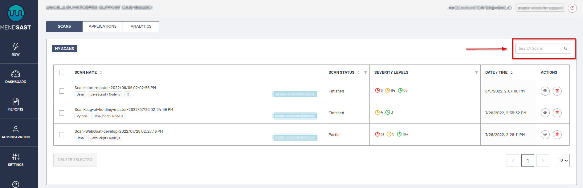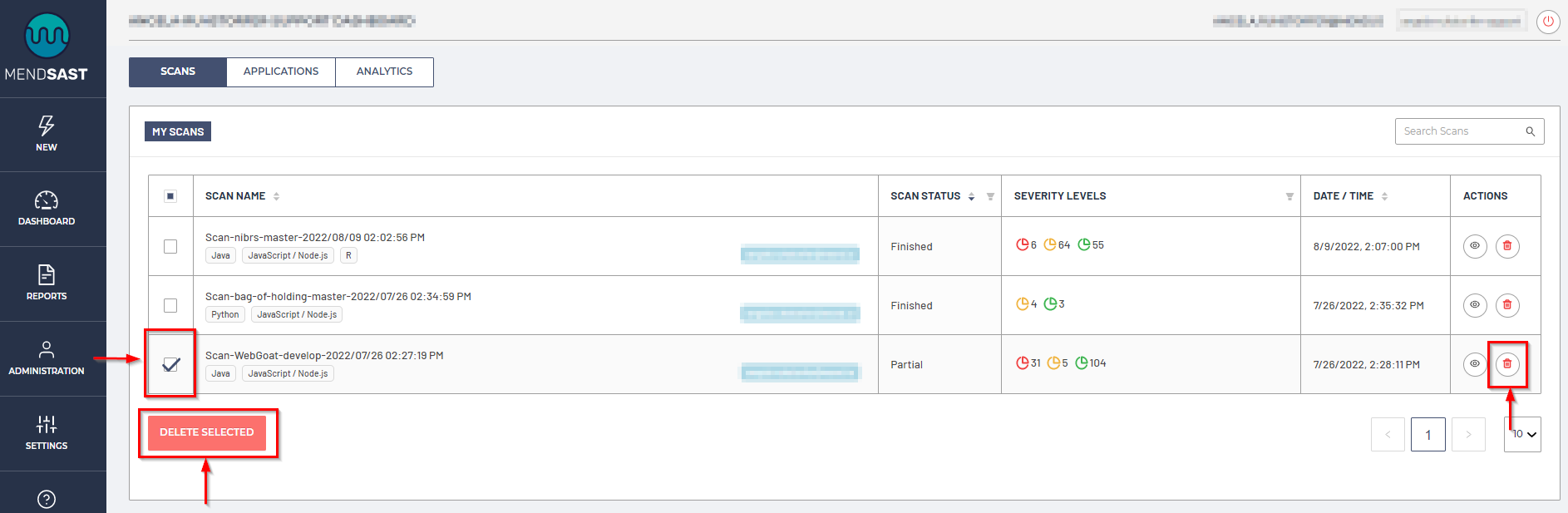 Deleting scans can be done by selecting a scan using a checkbox on the left side of the row and then clicking the Delete Selected button, or by clicking on the trashcan icon on the right side of the row: