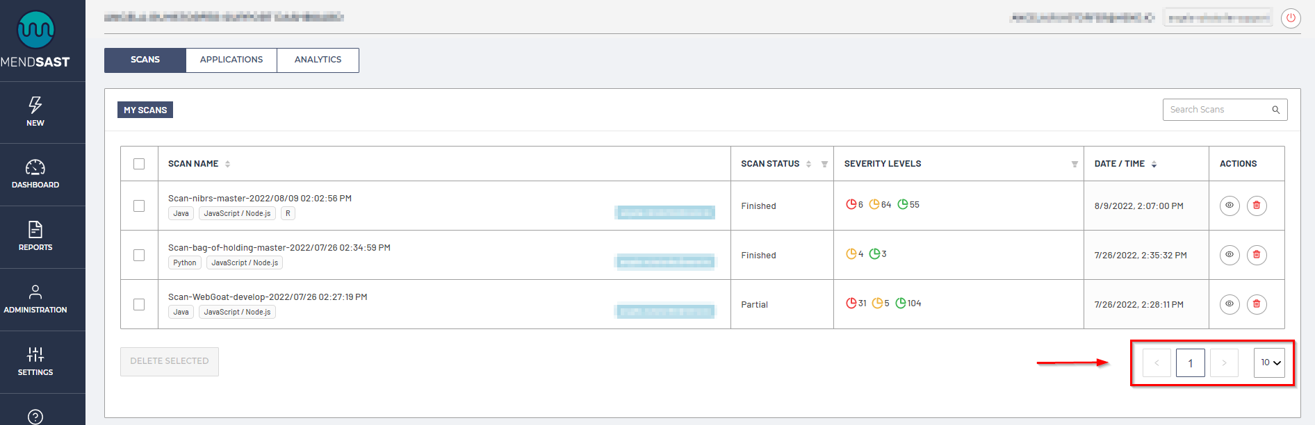 The default display will show 10 scans per page, which can be adjusted by selecting the drop-down menu in the lower right corner of the Scans tab (up to 50 scans per page):
