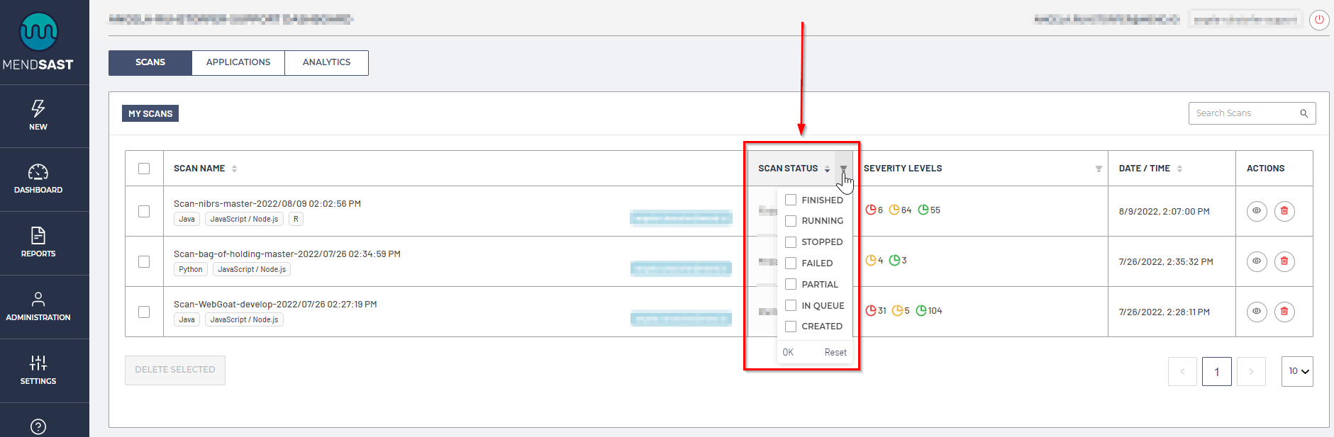 To filter the results by Scan Status, click on the filter icon in the Scan Status column and choose one or more values: