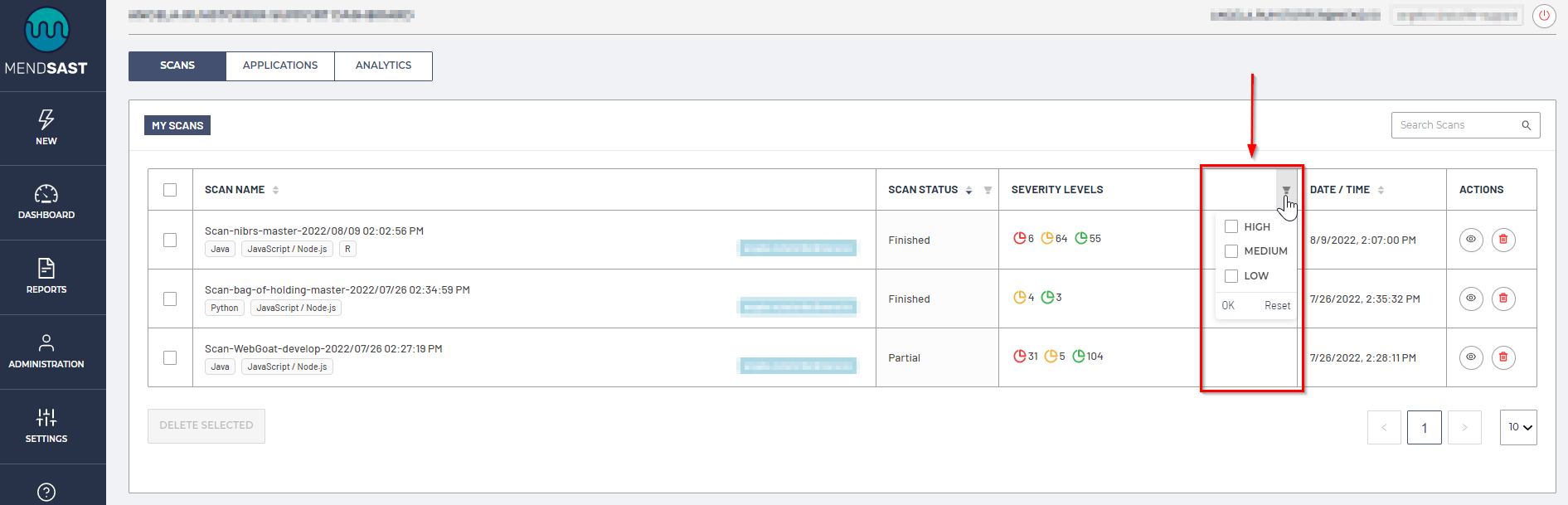 To filter the results by Severity Levels, click on the filter icon in the Severity Levels column and choose one or more values: