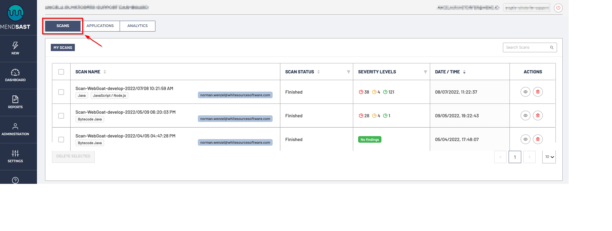 The Scans tab displays all scans linked to your organization: