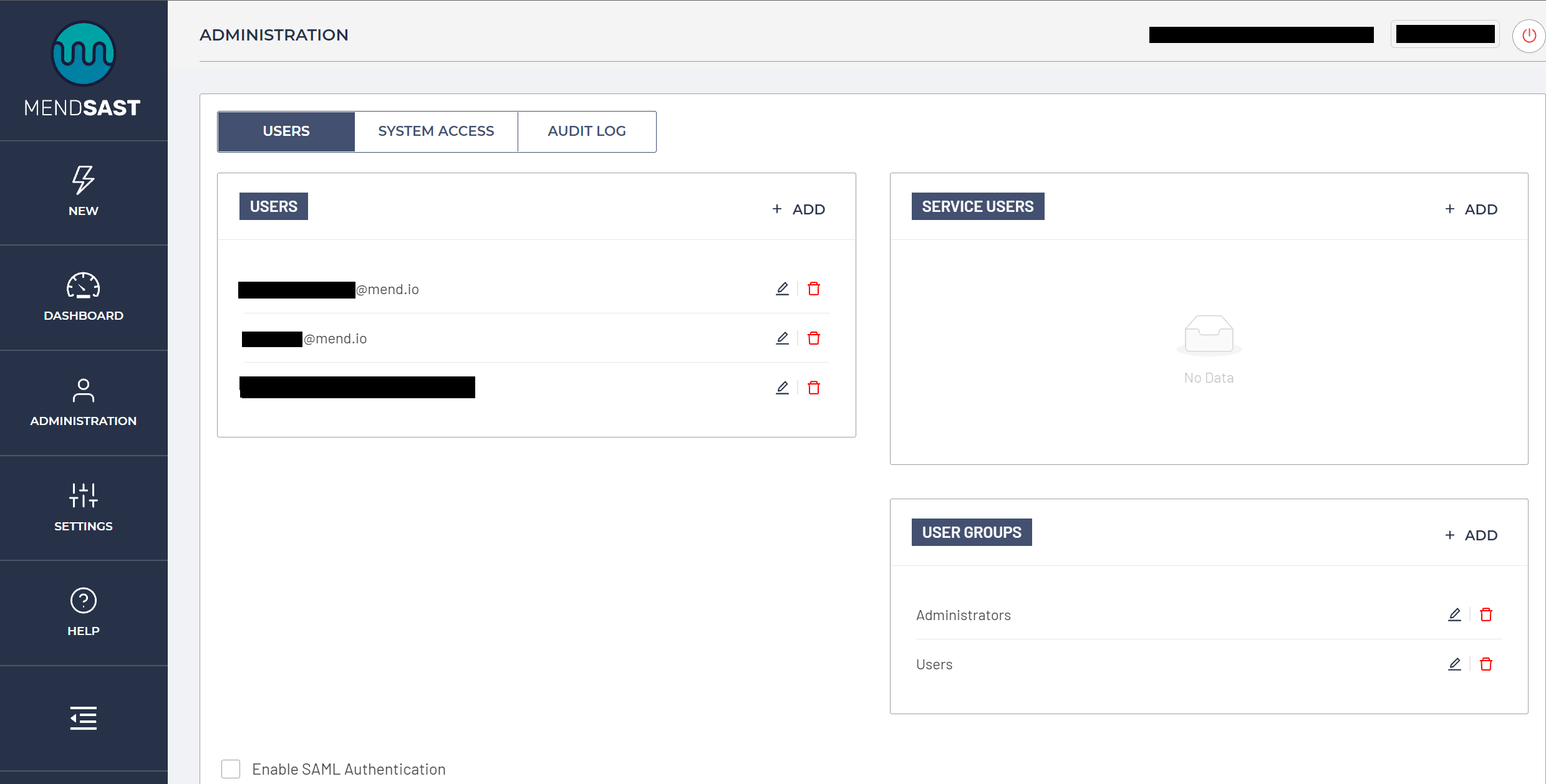 NOTE: You can enable SAML authentication for all users by checking Enable SAML Authentication in the lower left corner.