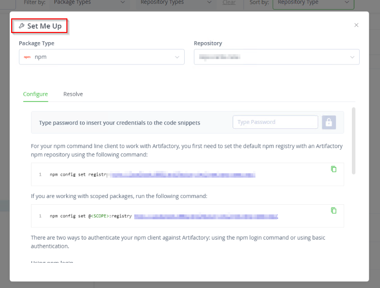 CODEnpm config set registry http://your-artifactory-url:port/artifactory/api/npm/repo-name/Using the credentials set when creating the Artifactory repository, run the following command: