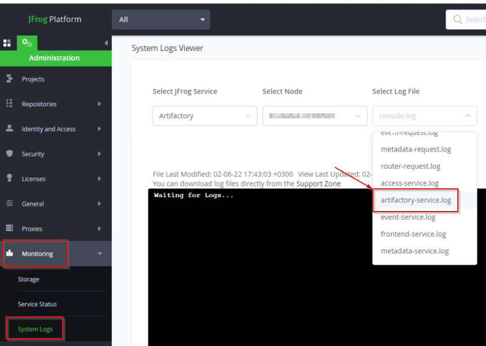 The Artifactory service log file can be found under - $JFROG_HOME\artifactory\var\log\artifactory-service.log. It can also be viewed in JFrog from the Administration tab under Monitoring → System Logs → Select Log File → artifactory-service.log.