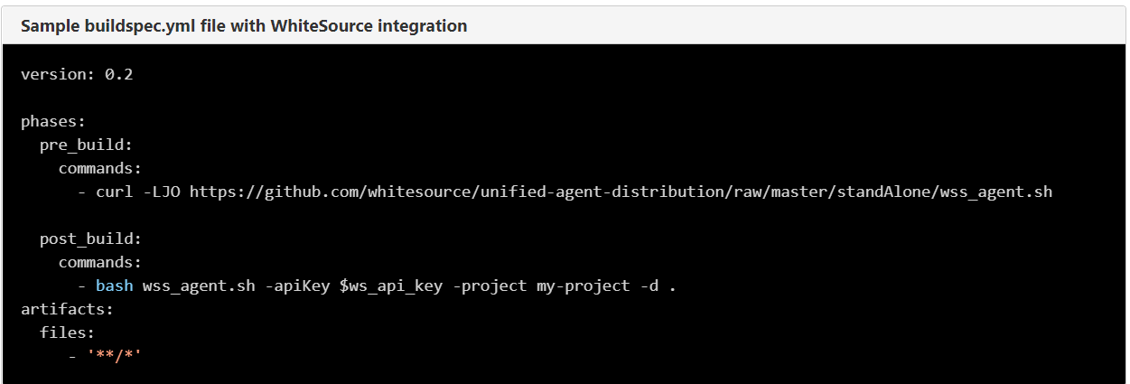 This step will download the wss_agent.sh script file to AWS CodeBuild server.NOTE: It is advised to use the curl command only once a week to download the latest version of the Unified Agent for performance reasons and not as part of every build. You can do this using a scheduler task, such as cron.