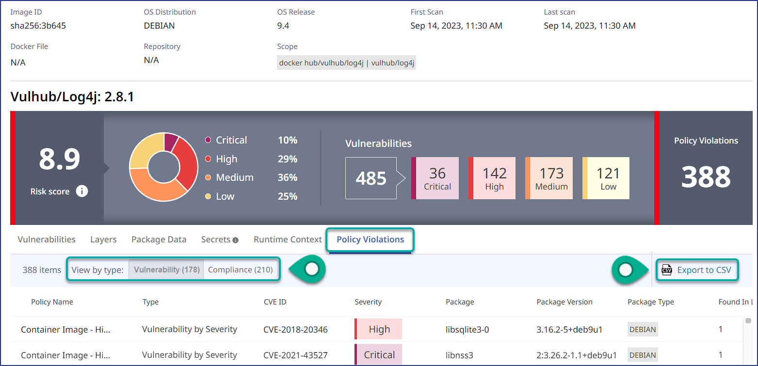 View the Policy Violations tab. Here, you can see the policy violations by Match Type for the image, as well as export this data to a CSV file: