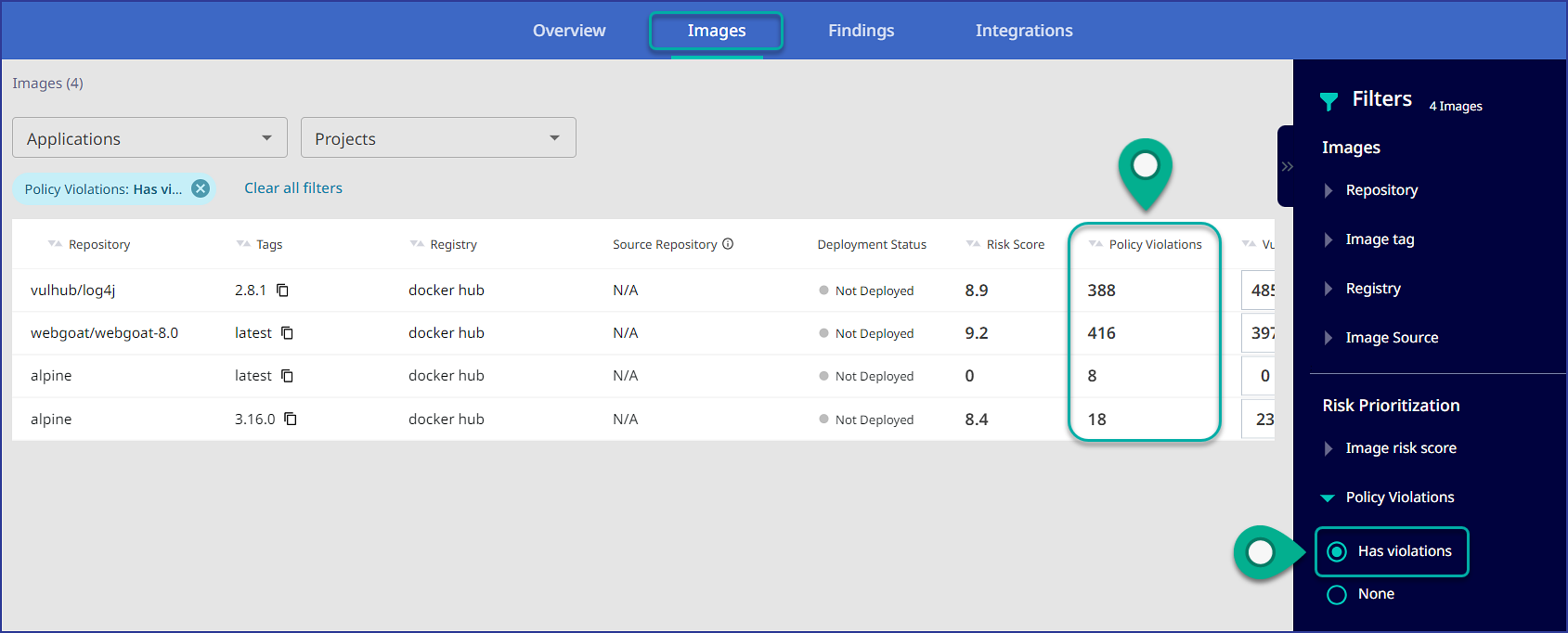 Within the Images tab overview, you can see and filter the data table on policy violations: