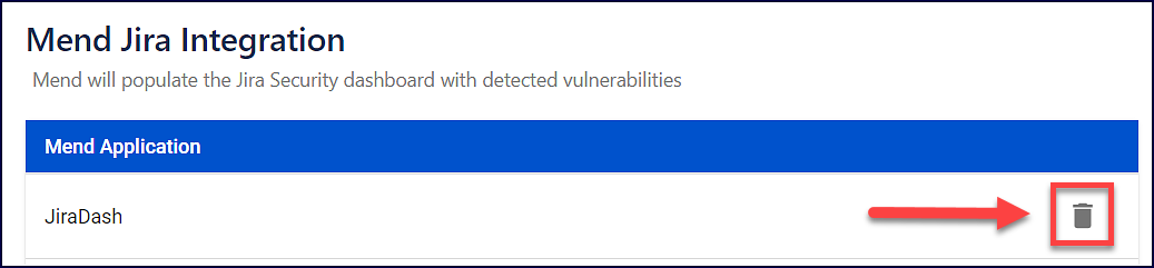 To delete a Mend product from the Mend Jira Integration mapping page, click on the trashcan icon next to the Mend product: