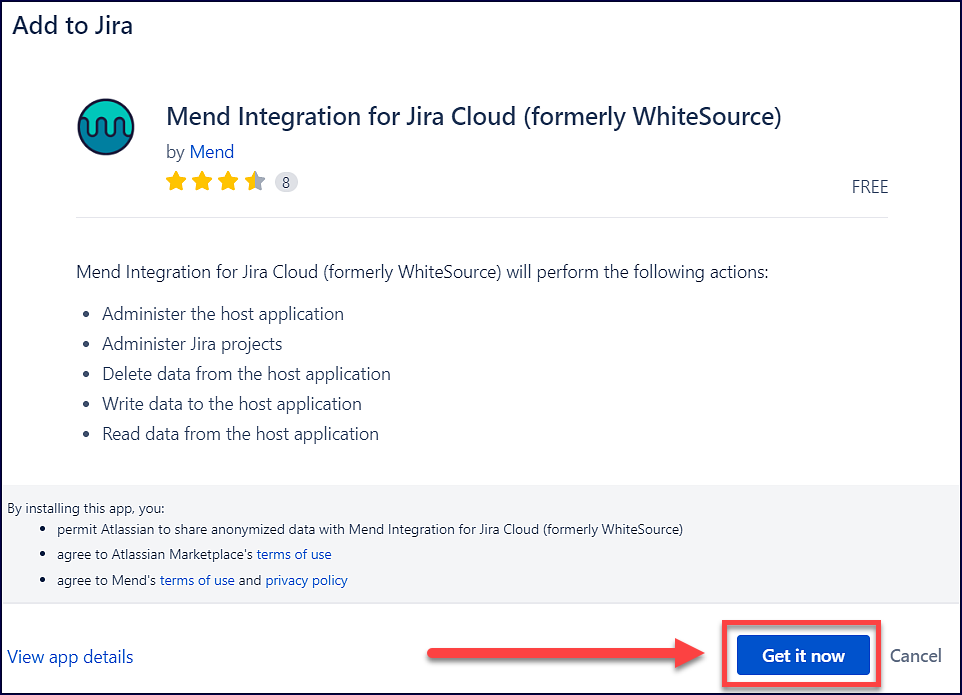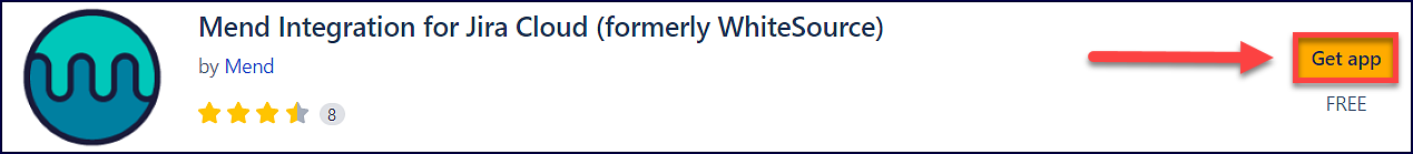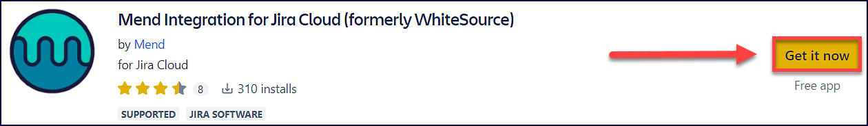 Navigate to the Mend Integration for Jira Cloud plugin page in the Atlassian Marketplace and click on the Get it now button: