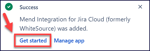 Once the installation is completed, another pop-up window will appear to notify you as well as provide direct links to the activation page of the Mend plugin (Get started) and the Manage apps page of your Jira Instance (Manage App). Click on the Get started option: