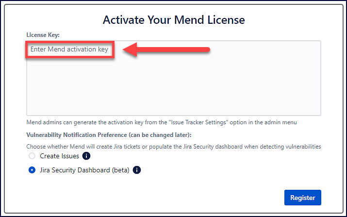 Click on the Register button to activate the Mend Jira Cloud plugin: