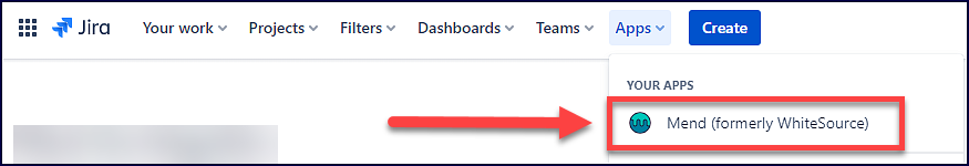 Access the Mend Jira Integration mapping page by navigating to Apps → Your Apps → Mend (formerly WhiteSource) in the toolbar at the top of your screen within Jira: