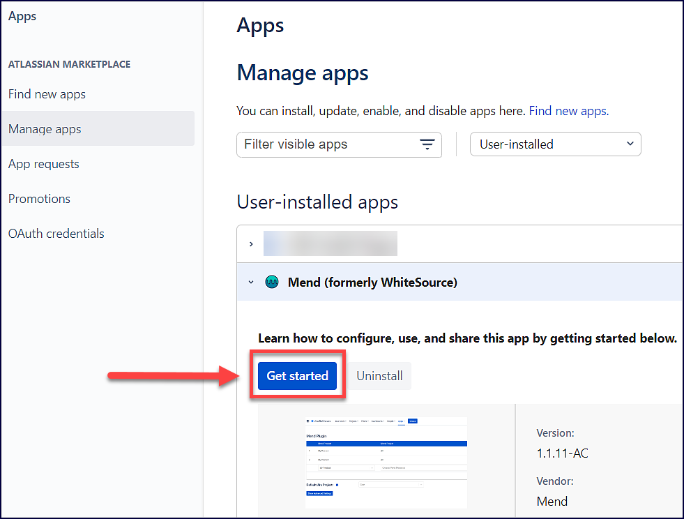 You can also get to the Mend Jira Integration mapping page by navigating to Apps → Manage your Apps → Mend (formerly WhiteSource) → click on the Get started button: