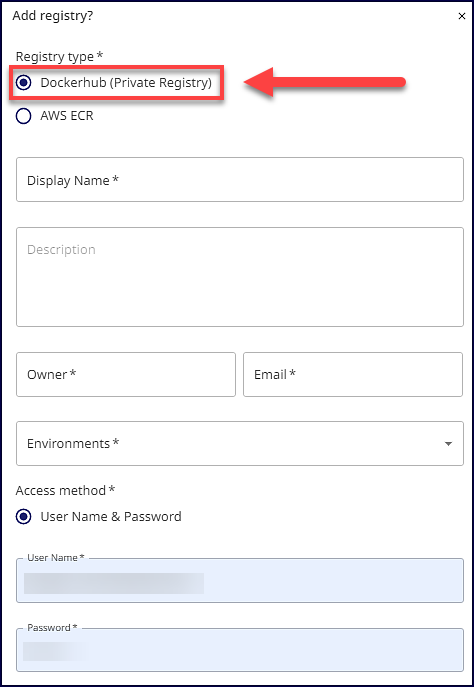 Environments | Select the type of environment of your private Docker Hub registry (multiple options can be selected). The environment options are: