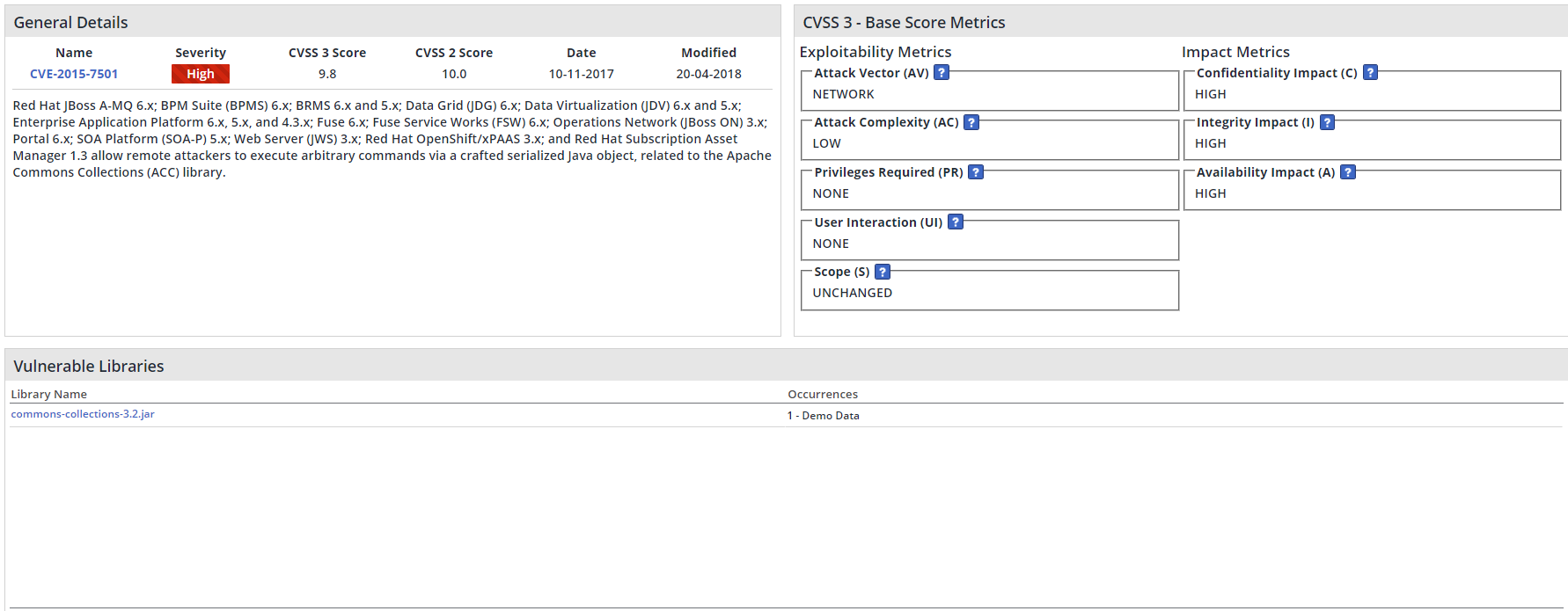 Vulnerability ID: The vulnerability identifier, which can consist of two vulnerability types: 'CVE' and 'WS' (see definitions on Working with Vulnerabilities). Clicking the Vulnerability ID link displays the vulnerability details, a link to MITRE source, the CVSS3 base score metrics (when available), a link to the library's CVE web page (when relevant) and provides a fix (if it exists):