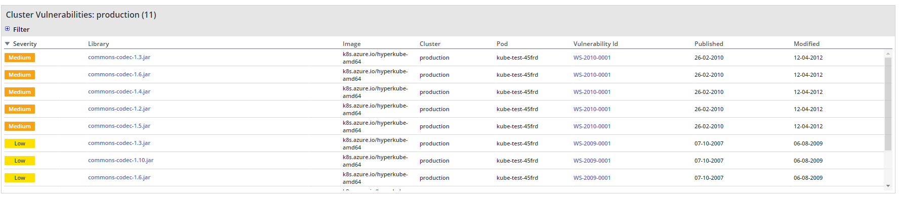 This dashboard provides a clear view of the Kubernetes resources along with the ability to filter, sort, and view the vulnerabilities per pod in the cluster. It includes the following scope views: