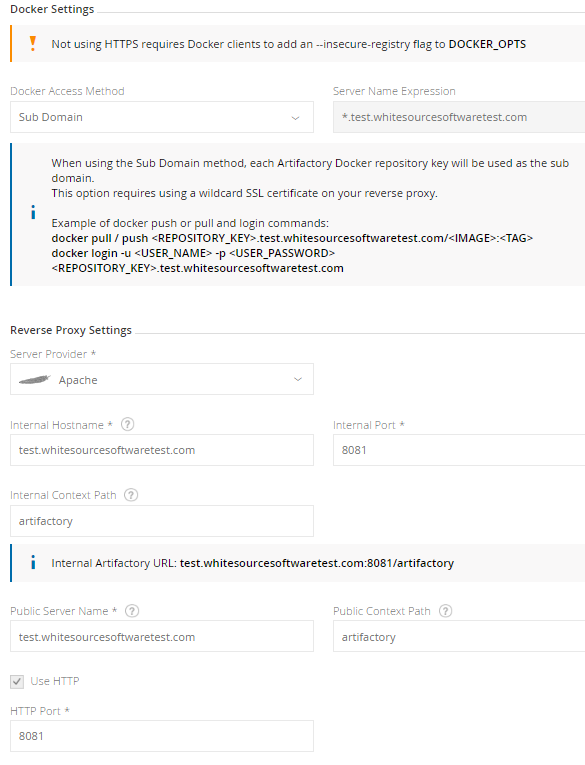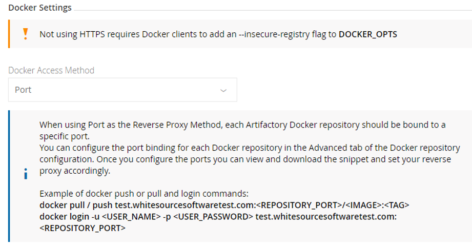 Note that in order for all of your Docker repositories to be included in your reverse proxy configuration, you first need to set the port for each Docker repository defined in your system, and only then generate the reverse proxy configuration. Note also that each repository must be bound to a unique port.