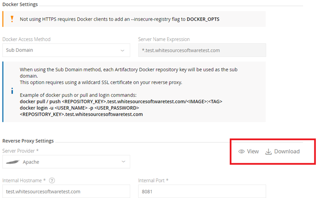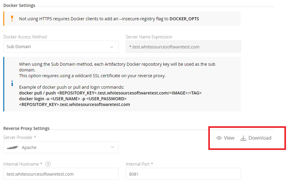 CODE$ curl -u <user>:<password> -X GET "http://test.whitesourcesoftwaretest.com:8081/artifactory/api/docker/docker-virtual/v2/_catalog“(The following API requires admin user credentials only). Rest API retrieves the reverse proxy configuration; verify that the repositories' ports appear and have correct values: