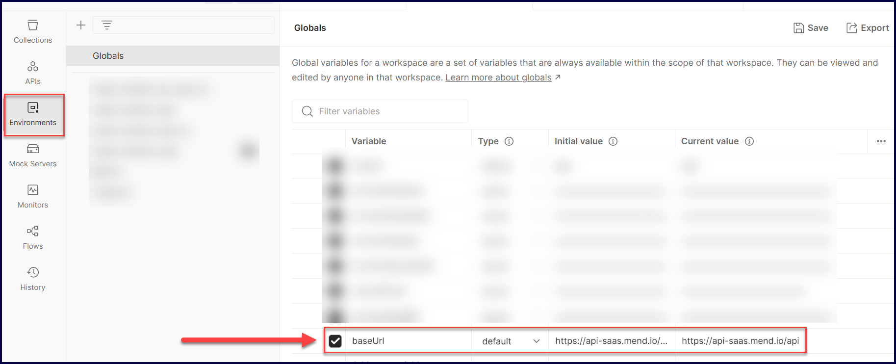 {{baseUrl}}environment variable in Postman. You can set this in your Collection-level variables, Globals, or use a separate, dedicated environment for the Mend API and create the{{baseUrl}}environment variable there: