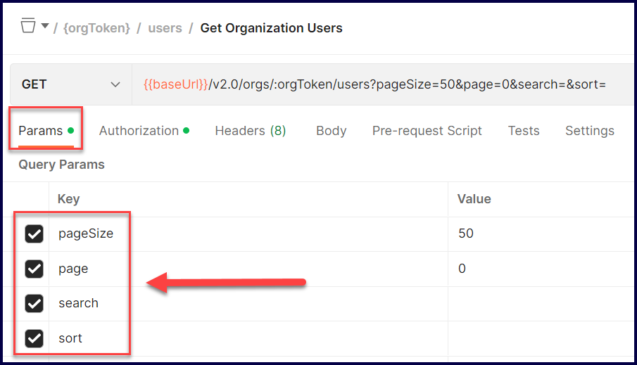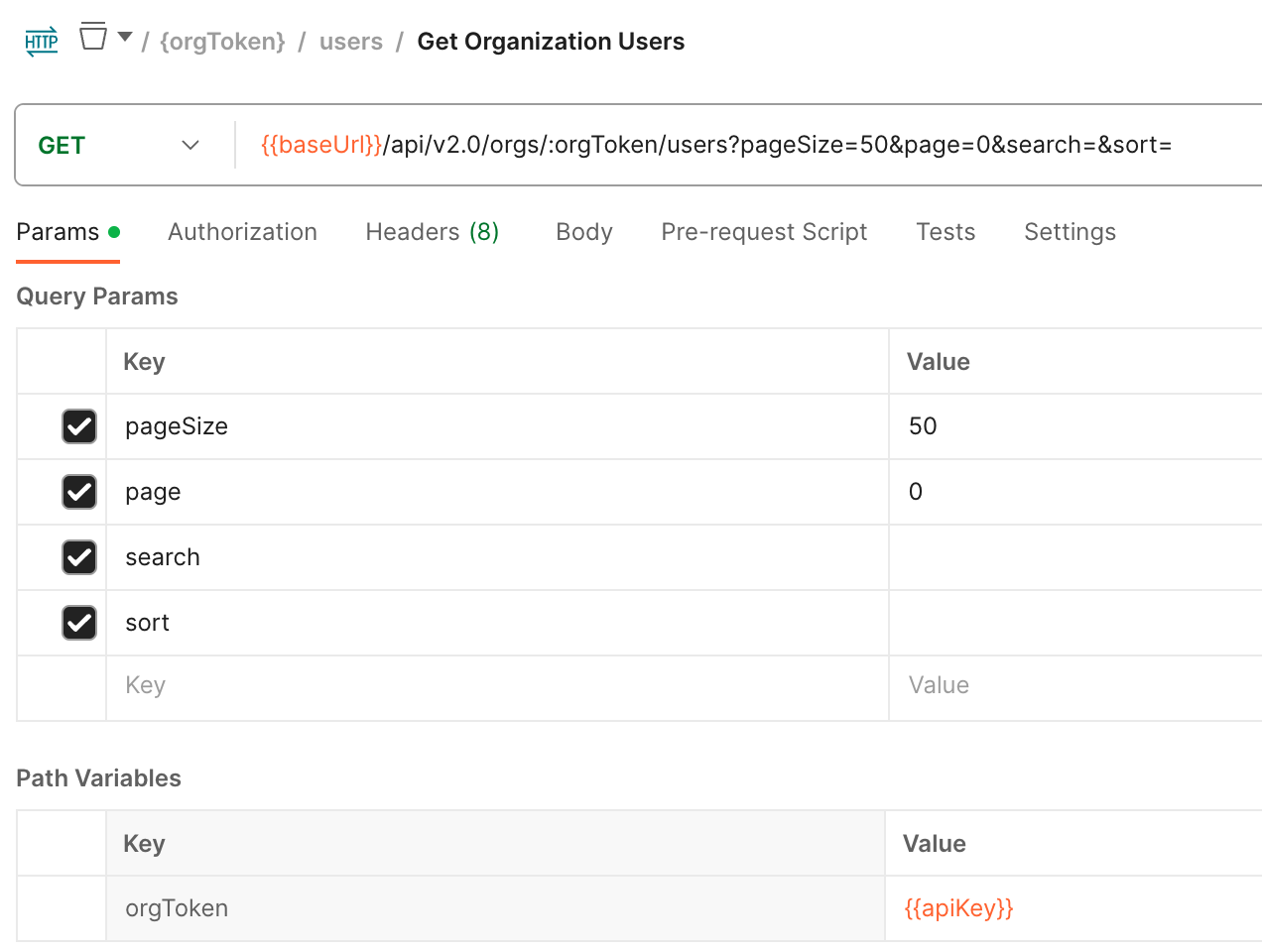 Continuing with our Get Organization Users call example, you will also need to set your orgTokenin the Path Variables. To do so: