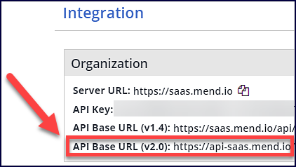 Find and copy your base URL from the Mend SCA App → Integrate → Organization → API Base URL (v2.0). The format of the URL is: