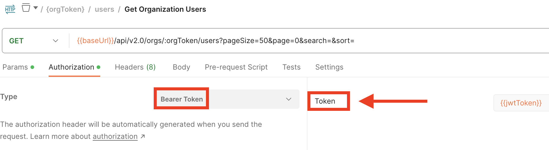 Let’s use the Get Organization Users call as an example. To add the jwtToken to the call in Postman: