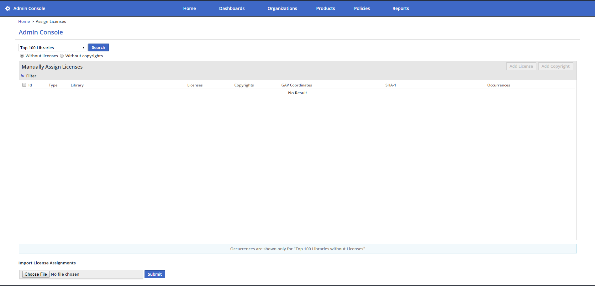 This will show by default all libraries without a license, but you can select other options to filter as needed