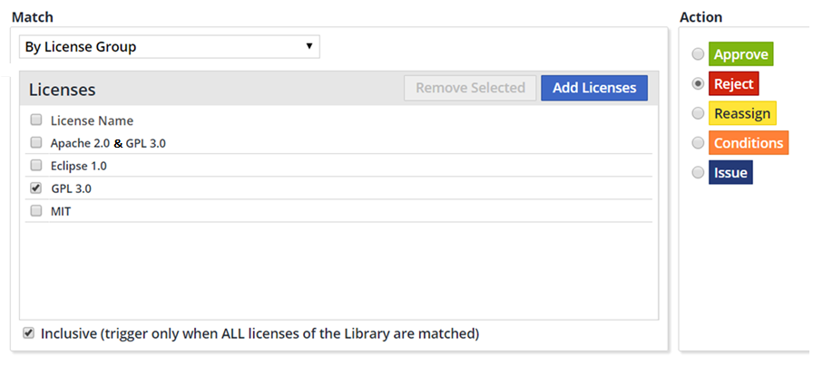 If you want to trigger the policy’s action only when allof the licenses of the library match those defined in the policy, select the checkbox Inclusive(trigger only when ALL licenses of the library are matched).