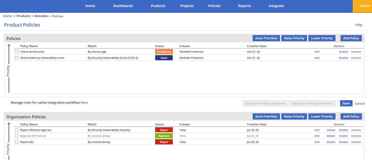The next step is to create distinct sets of policies for each product. These policies will then be automatically enforced in the corresponding tools during the different steps of the SDLC. In our example: