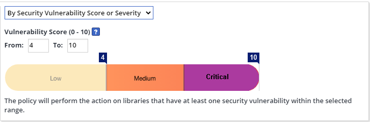 You can enter the values for the severity score in the boxes or by dragging the sliders. Following are the ranges for the severity score: Low: 0.1-3.9 Medium: 4.0-6.9 High: 7-8.9 Critical: 9.0-10 The policy will perform the action on libraries that have at least one security vulnerability within the selected range.