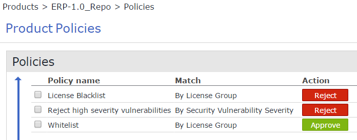 ERP-1.0_Repo will reject only high-severity security vulnerabilities and blacklist GPL type licenses. It will whitelist all the rest and allow them into the repository: