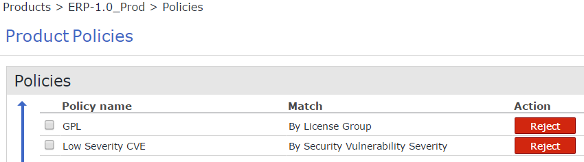 In order to differentiate between policies, each policy is named according to its level, type of security vulnerability with CVSS score, license policy, etc., where relevant. For example: