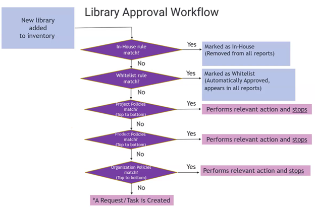 The review process investigates any new library that does not match an In-House or Whitelist rule to determine if they are permitted to be used. Each new library is checked against the policies. The first policy that matches the library will determine the action that will be applied to the request. A library can match only one policy.