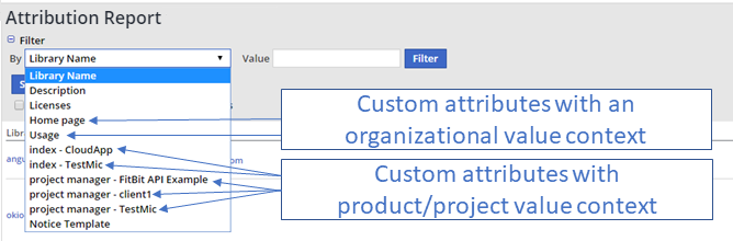 Custom attributes that include a product/project value context are displayed as a concatenated string that includes the custom attribute name and the product/project name separated by a hyphen: i.e., <attribute name> - <product/project name>.