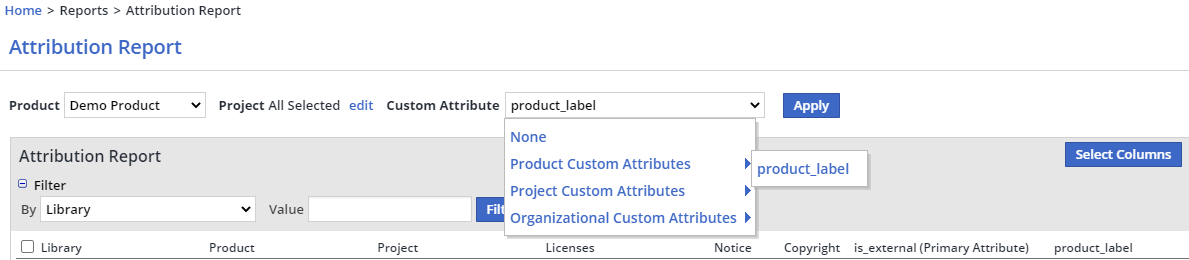 Custom attributes can be filtered according to their values and displayed in the Custom Attributes Report, where users can see all of their assigned libraries.