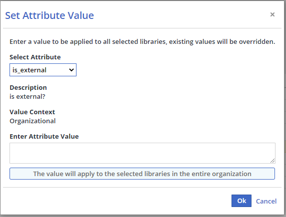 The Set Attribute Value dialog box is displayed.Enter an Attribute Value to be applied to all the selected libraries, and click OK.