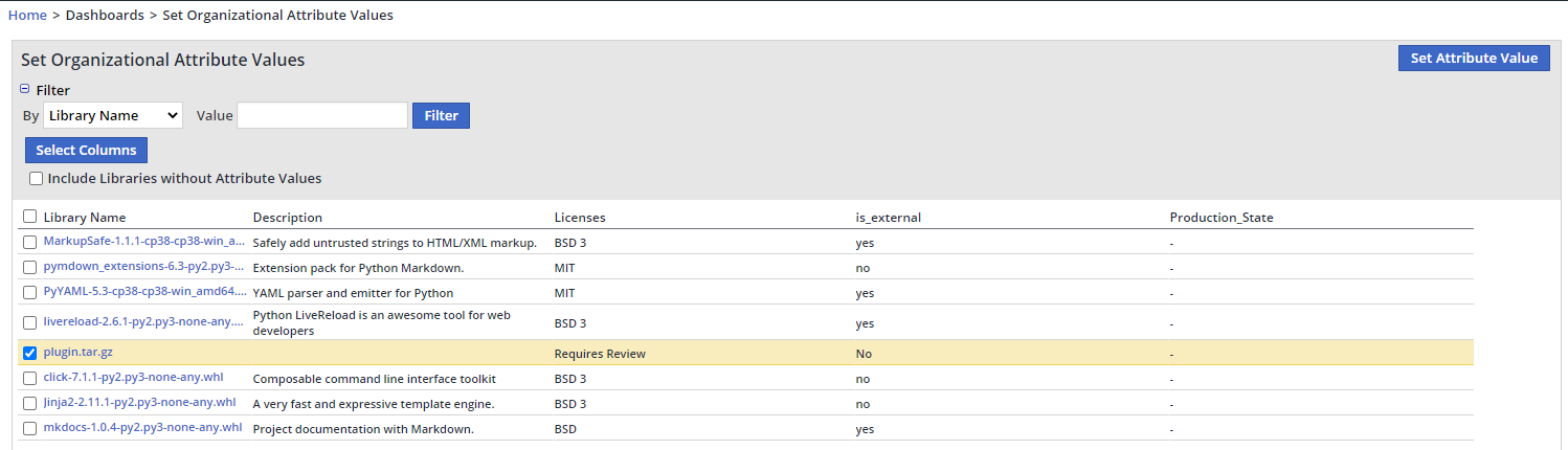 The following screen is displayed.Select a library or libraries for which you want to create an attribute and click Set Attribute Value.