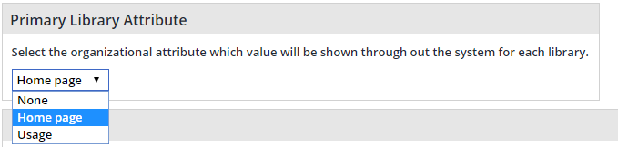If you have defined one or more organizational level attributes (see Setting the Organizational Attribute Values), select the Primary Library Attribute from the dropdown menu. The organizational attribute's value is displayed throughout the system for each library.
